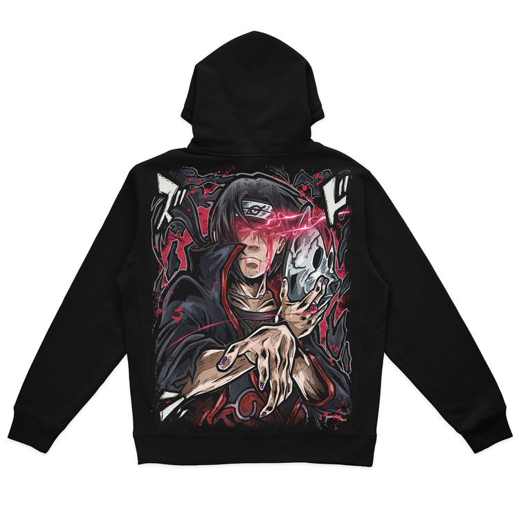 Premium Heavyweight Hoodie W/ Vibrant Jumbo Size Print Featuring Itachi in the midst of unleashing the formidable Amaterasu, the print strikingly portrays the cascading rivulets of blood from his eyes, highlighting the severe toll and power of his Uchiha heritage.