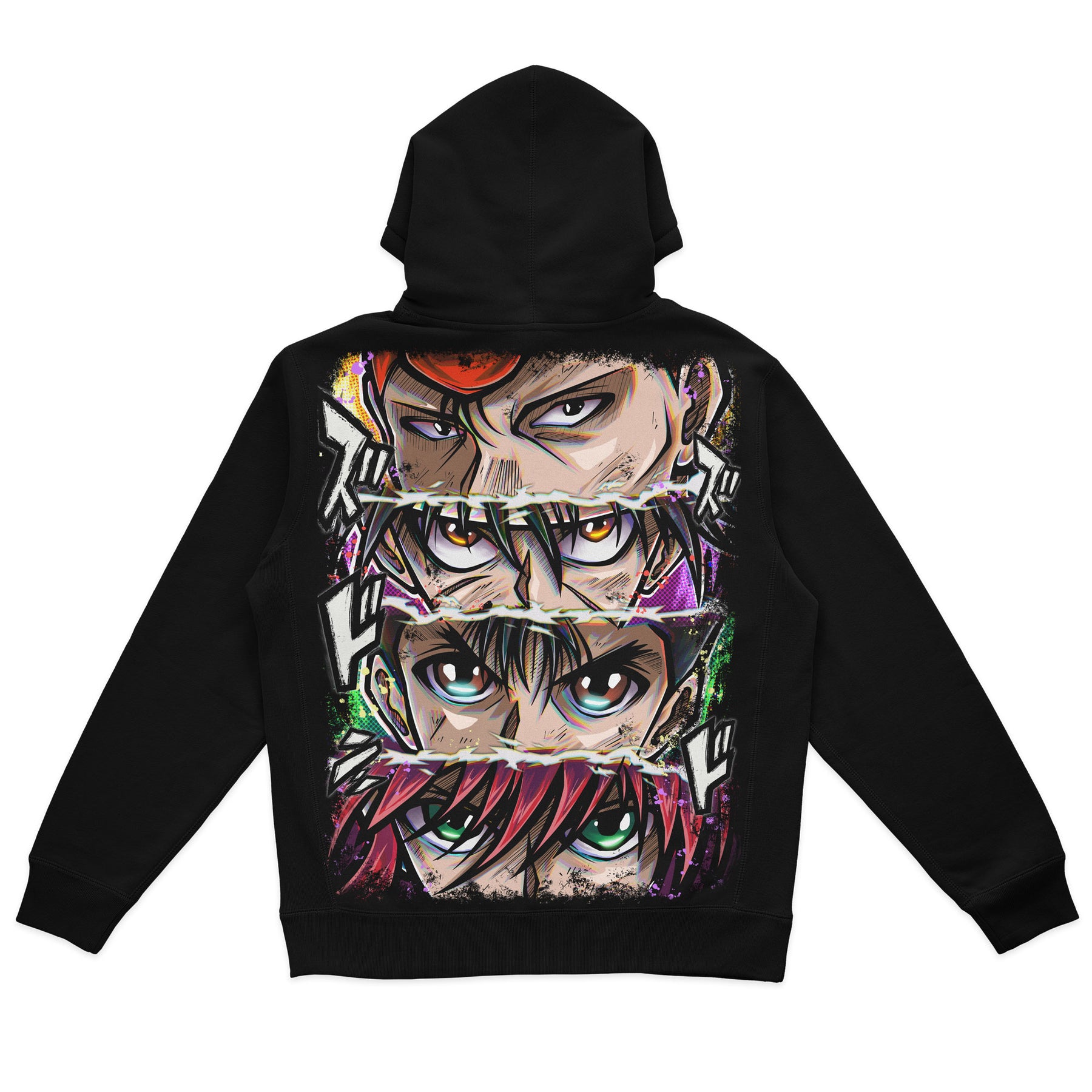 Premium Heavyweight Hoodie W/ Vibrant Jumbo Size Print Featuring the unstoppable Team Urameshi -- Kazuma, Hiei, Yusuke, and Kurama -- captured in a print that embodies their tenacious spirit, united as friends and warriors, their mere presence radiating unmatched strength and determination.